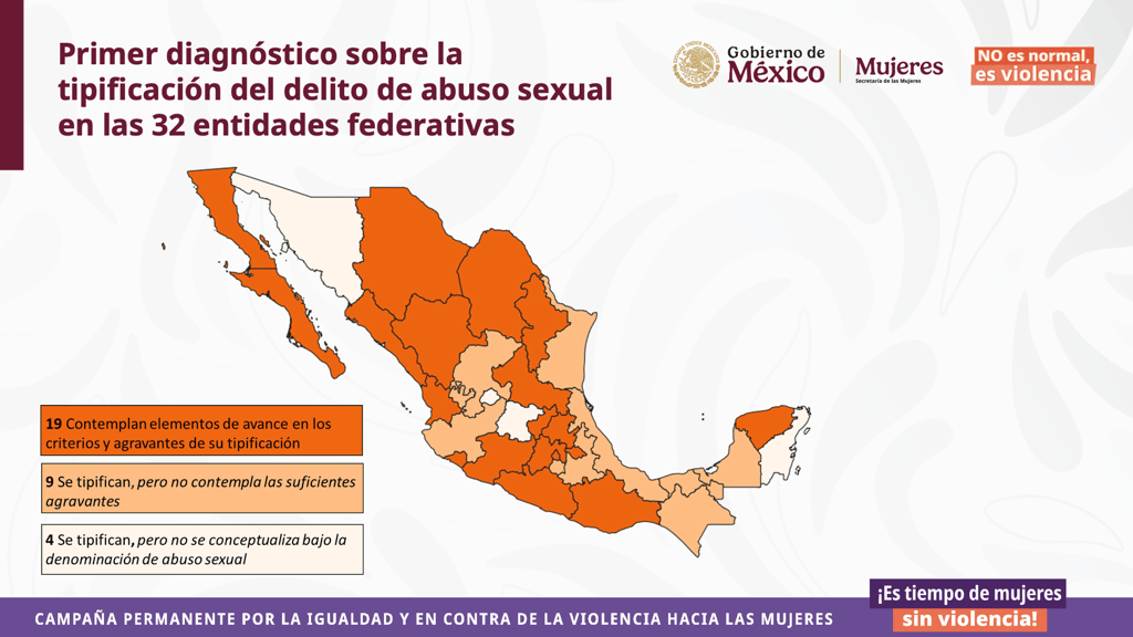 Una de las principales estrategias del plan es lograr que el abuso sexual sea considerado delito grave en todas las entidades federativas. Para ello, la Secretaría de las Mujeres realizó un primer diagnóstico nacional.