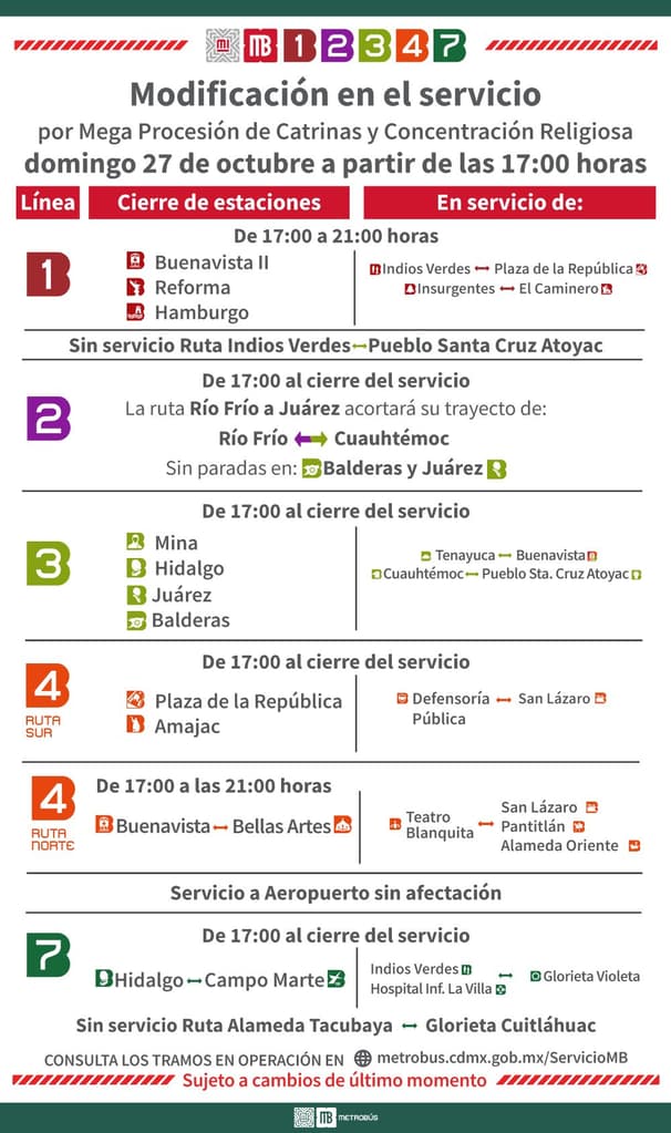 El Metrobús anunció modificaciones en su servicio para este domingo 27 de octubre debido a la Mega Procesión de Catrinas, un evento que año con año se celebra en la Ciudad de México como parte de las festividades del Día de Muertos.
