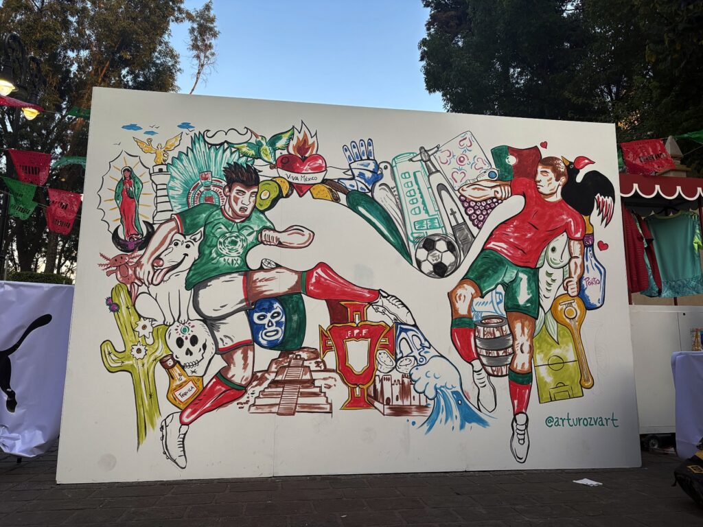 Mientras el público disfrutaba del evento, el artista Arturo Zúñiga Vega realizó en vivo un mural pintado a mano, en el que destacaban dos futbolistas de ambas naciones disputando un balón. Alrededor, se integraron elementos representativos de ambos países, como la Virgen de Guadalupe y el picante, así como el Santuario Nacional de Cristo Rey y los viñedos portugueses.