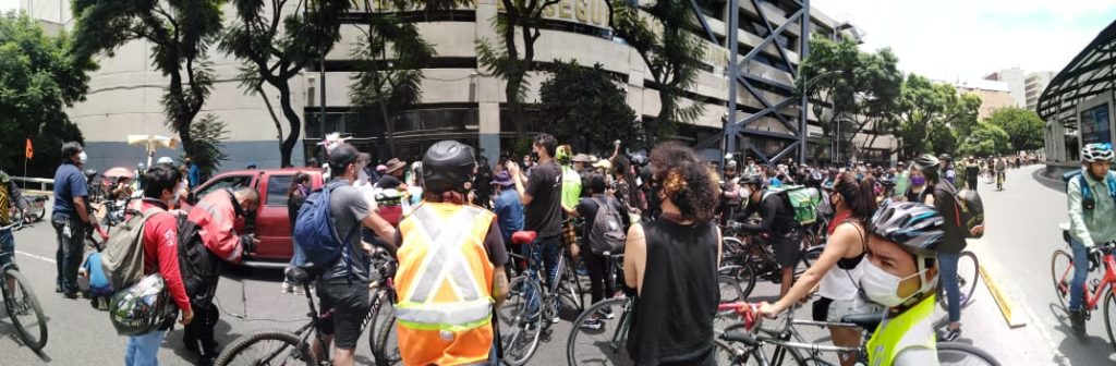 La caravana de bicicletas continuó por Avenida Insurgentes, haciendo una parada en la Secretaría de Seguridad Ciudadana donde leyeron un pronunciamiento.