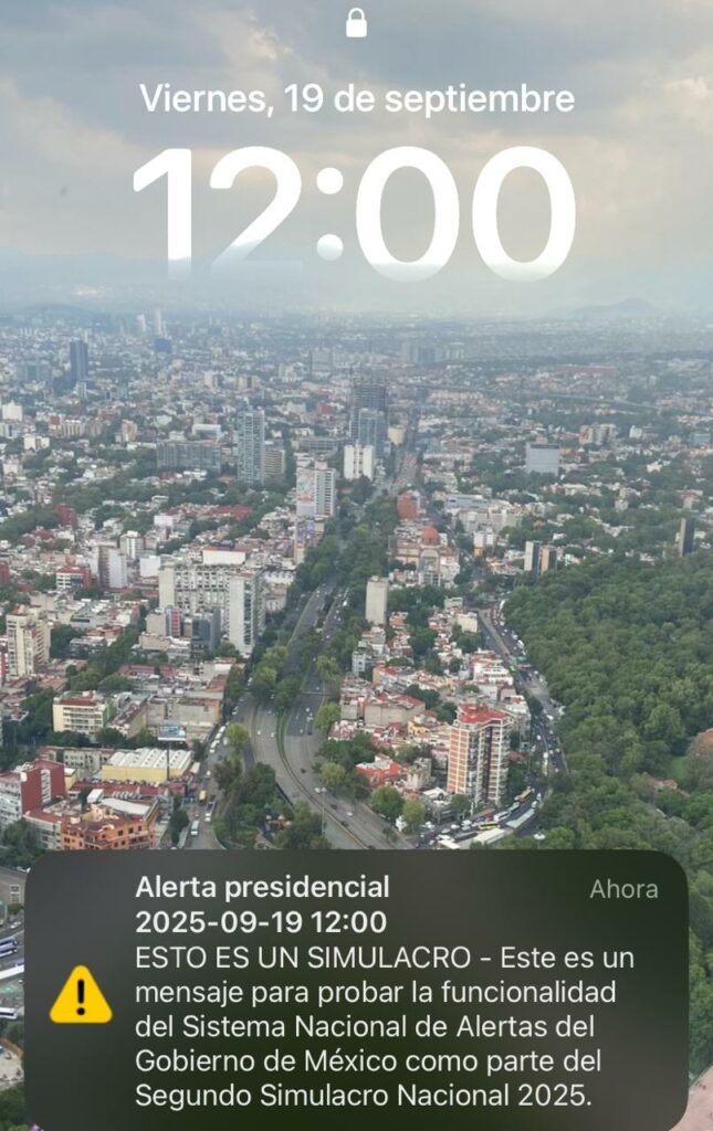 “Mensaje de prueba. Este es un mensaje para probar el Sistema Nacional de Alertas del Gobierno de México, como parte del simulacro nacional llevado a cabo el día 19/09/25”, se pudo leer en las pantallas de los teléfonos celulares. Además, el mensaje llegó acompañado de un sonido de alerta.