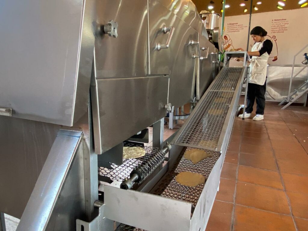 Posteriormente, el maíz molido se hidrata y se pasa a una máquina amasadora. Finalmente, la masa se vierte en la tortilladora, que tiene capacidad para producir hasta 50 kilos de tortillas por hora.