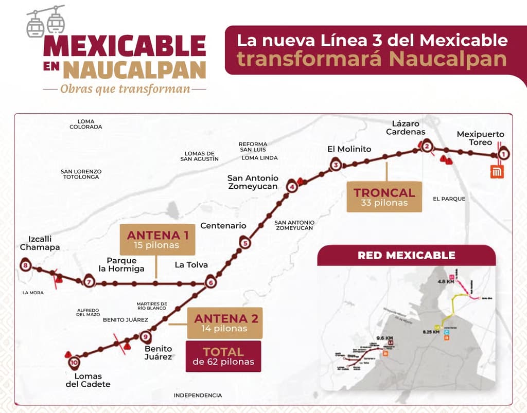 La Línea 3 del Mexicable, que actualmente se construye en Naucalpan, tendrá una longitud de 9.5 kilómetros y contará con 10 estaciones.
