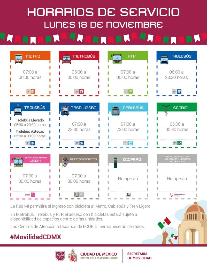 “Con motivo de la conmemoración del inicio de la Revolución Mexicana, la Red de Movilidad Integrada informa los horarios de operación que tendrán diversos organismos de transporte para el lunes 18 de noviembre, considerado como día feriado oficial”, anunció la Secretaría de Movilidad de la Ciudad de México.