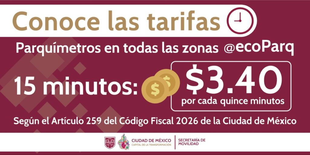 “La tarifa autorizada para parquímetros a partir del 01 de enero del 2026 es de $3.40 pesos por cada 15 minutos”, de acuerdo con el Artículo 259 del Código Fiscal 2026 de la Ciudad de México.