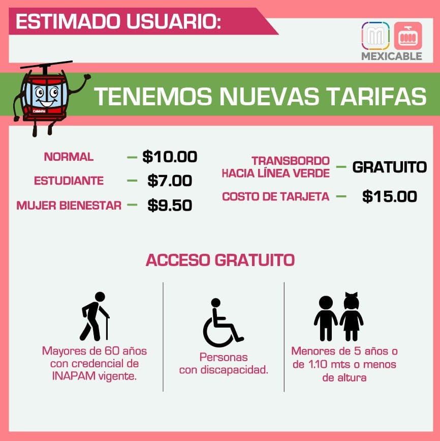 El costo del pasaje del Mexibús y del Mexicable subió un peso. Así, la tarifa del Mexibús, que era de 9 pesos, aumentó a 10 pesos, mientras que la del teleférico también pasó de 9 a 10 pesos.