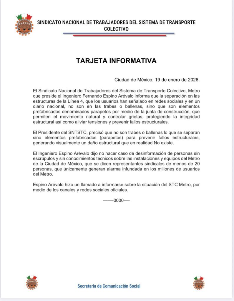 Luego de que usuarios del Metro y de redes sociales reportaron una separación entre estructuras del tramo elevado de la Línea 4, el Sindicato Nacional de Trabajadores del Sistema de Transporte Colectivo emitió un comunicado explicando que se trata de parapetos con una función específica.