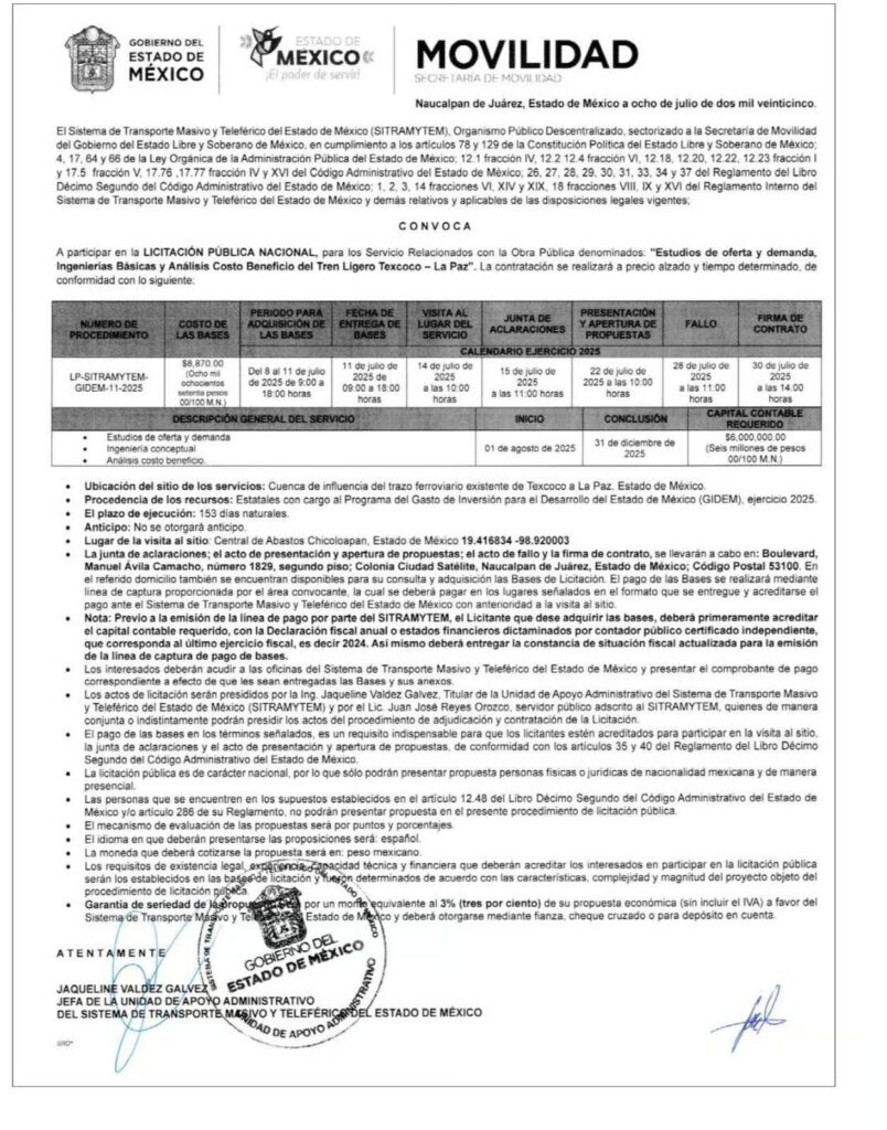 El pasado 8 de julio de 2025 el Gobierno de Edomex lanzó la licitación para realizar los estudios de oferta y demanda, la ingeniería conceptual y en análisis costo beneficio del Tren Ligero de Texcoco a La Paz.