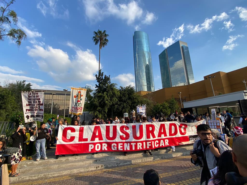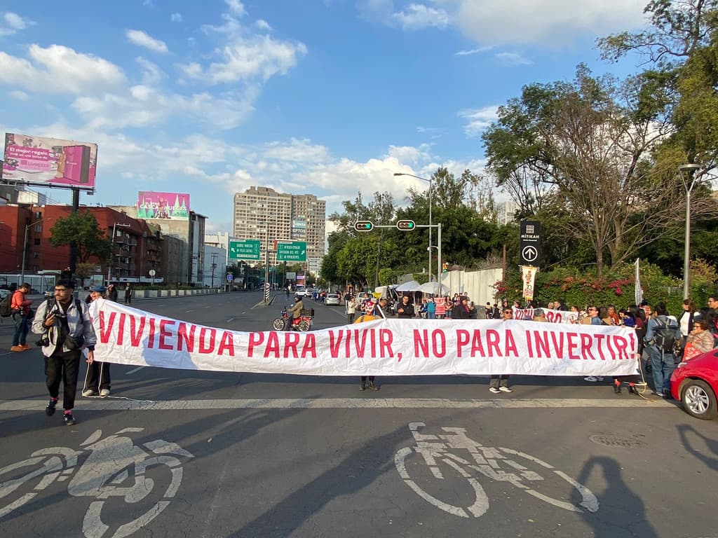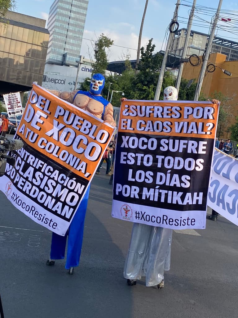 Al grito de “La ciudad se habita, no se vende”, los habitantes de Xoco estuvieron acompañados por organizaciones que luchan contra la gentrificación, como el Frente por la Vivienda Joven, el Foro de Mujeres Originarias de los Pueblos y Barrios de la Cuenca del Valle de Anáhuac y el Frente Antigentrificación.