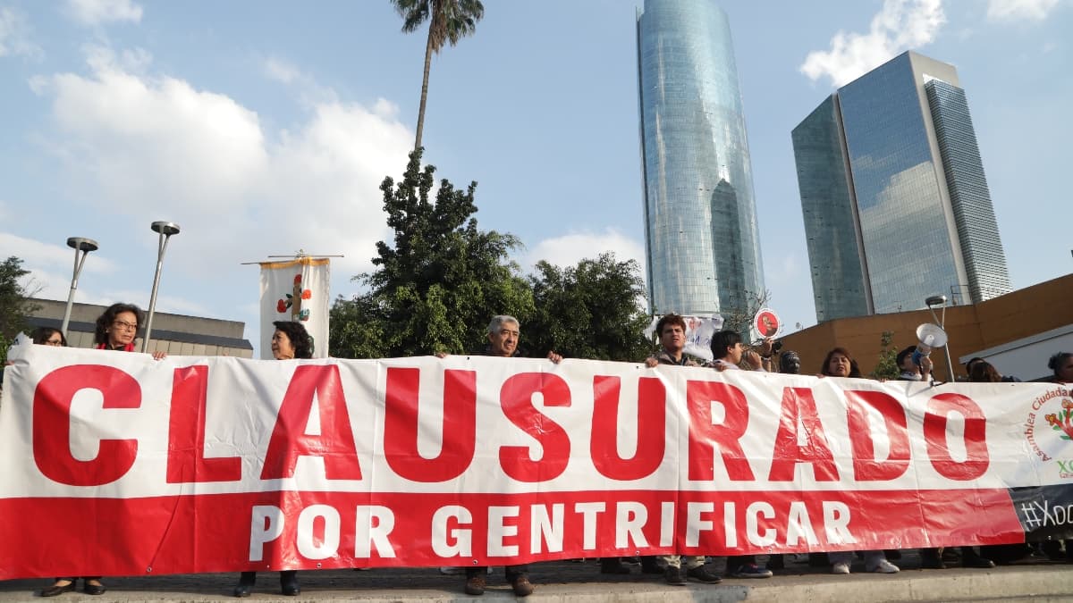 Al grito de “La ciudad se habita, no se vende”, los habitantes de Xoco estuvieron acompañados por organizaciones que luchan contra la gentrificación, como el Frente por la Vivienda Joven, el Foro de Mujeres Originarias de los Pueblos y Barrios de la Cuenca del Valle de Anáhuac y el Frente Antigentrificación.