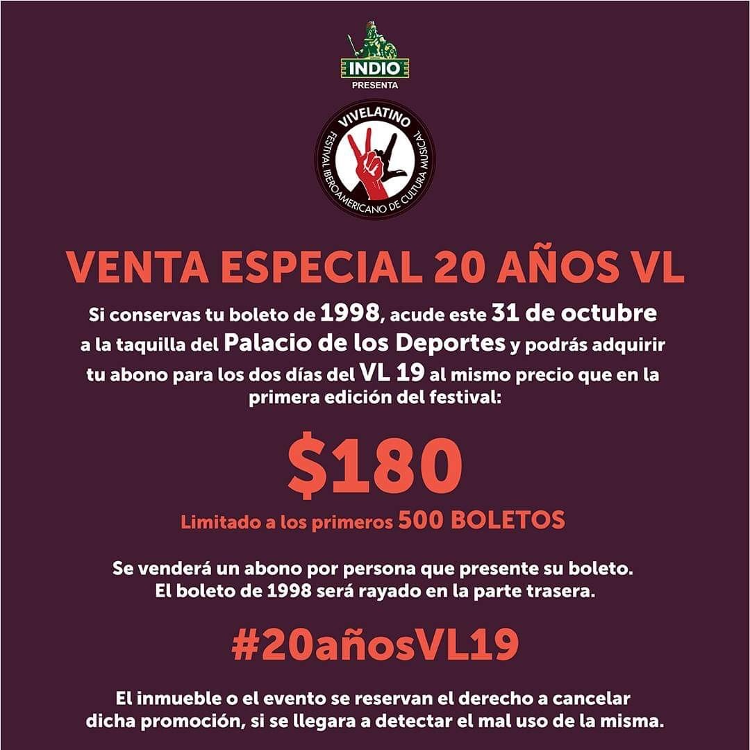 Para que hagan válida tu promoción de la venta especial Vive Latino 2019 es necesario que acudas este 31 de octubre a las taquillas del Palacio de los Deportes y que presentes tu boleto de la edición 1998 —o sea la primerita—, el cual será marcado en la parte posterior para que no lo vuelvan a usar.