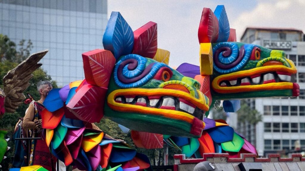 14:00 horas. El desfile inicia con el carro alegórico “Corazón de Tenochtitlan: 700 años”, una creación de El Volador que rinde homenaje a los orígenes de México. En él, serpientes emplumadas resguardan una piedra que conmemora los 700 años de Tenochtitlan, mientras que un águila posada sobre un nopal, inspirada en códices mexicas, simboliza la fundación de la gran metrópoli. Al fondo, el Huey Teocalli evoca la majestuosidad de una civilización que sigue viva en el México actual.