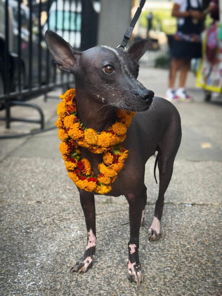 12:55 horas. Un majestuoso xoloitzcuintle, guardián del Mictlán, se prepara para el Desfile de Día de Muertos 2025 en la CDMX. Luciendo un collar de cempasúchil, posa con grandeza, esperando el inicio del evento en el Ángel de la Independencia.