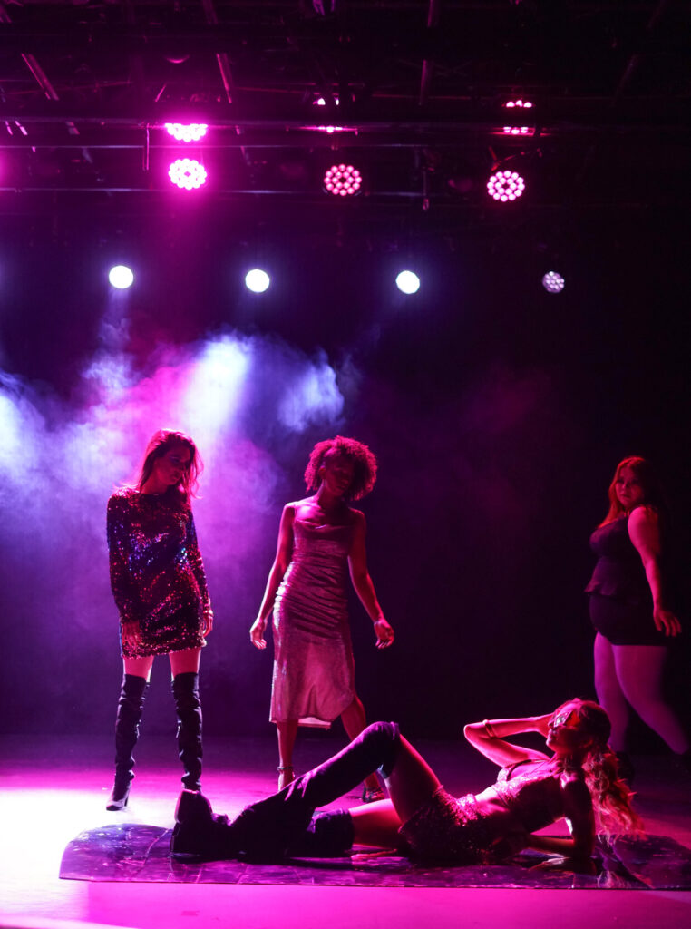 Como escenografía, solo hay unas mamparas con espejos móviles. El diseño de iluminación de Alberto Reyna le da al espacio un cariz pop. “Los vestuarios también son como entre pop actual y la estética de los 70, con muchas lentejuelas y muchos brillos, porque quería que el primer acercamiento dibujara este cuadro estético, de lo que aparentemente nos es atractivo y valoramos, y que el contraste estuviera entre la estética y el discurso. Visualmente la obra puede tener momentos atractivos y bellos, pero estamos criticando esa belleza desde el mundo de las ideas”.