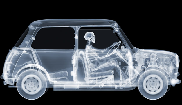 Una de mis favoritas es la radiografía del emblemático taxi Volkswagen sedan que durante tanto tiempo sirviera en las calles de nuestro país. La técnica está muy bien cuidada así que pueden ver prácticamente todos los elementos que componen al vehículo: la maquinaria del motor, las llantas, los asientos, los números de las placas y otros elementos más sutiles como el rosario colgando en el espejo y las deformaciones en los asientos. Desde luego que esto apela a una iconografía muy específica de nuestra ciudad que incluso hoy encontramos.