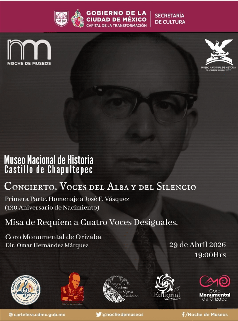 El espectáculo se llama Voces del alba y del silencio y se presentará en el Museo Nacional de Historia, Castillo de Chapultepec, como parte de la programación nocturna del último miércoles del mes. La actividad está anunciada para el miércoles 29 de abril de 2026 a las 19:00 horas en el Patio de eventos.