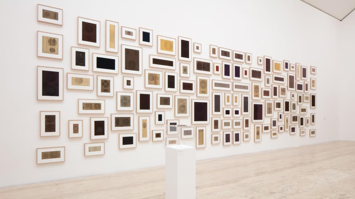 La sección Tacto apela a la memoria corporal: desde la primera obra que De la Mora creó siendo niño ( m-294 [1972]), hasta composiciones hechas con telas de bocinas o suelas gastadas que conservan las huellas del movimiento humano (1,152 – I / Pi. [2014]).