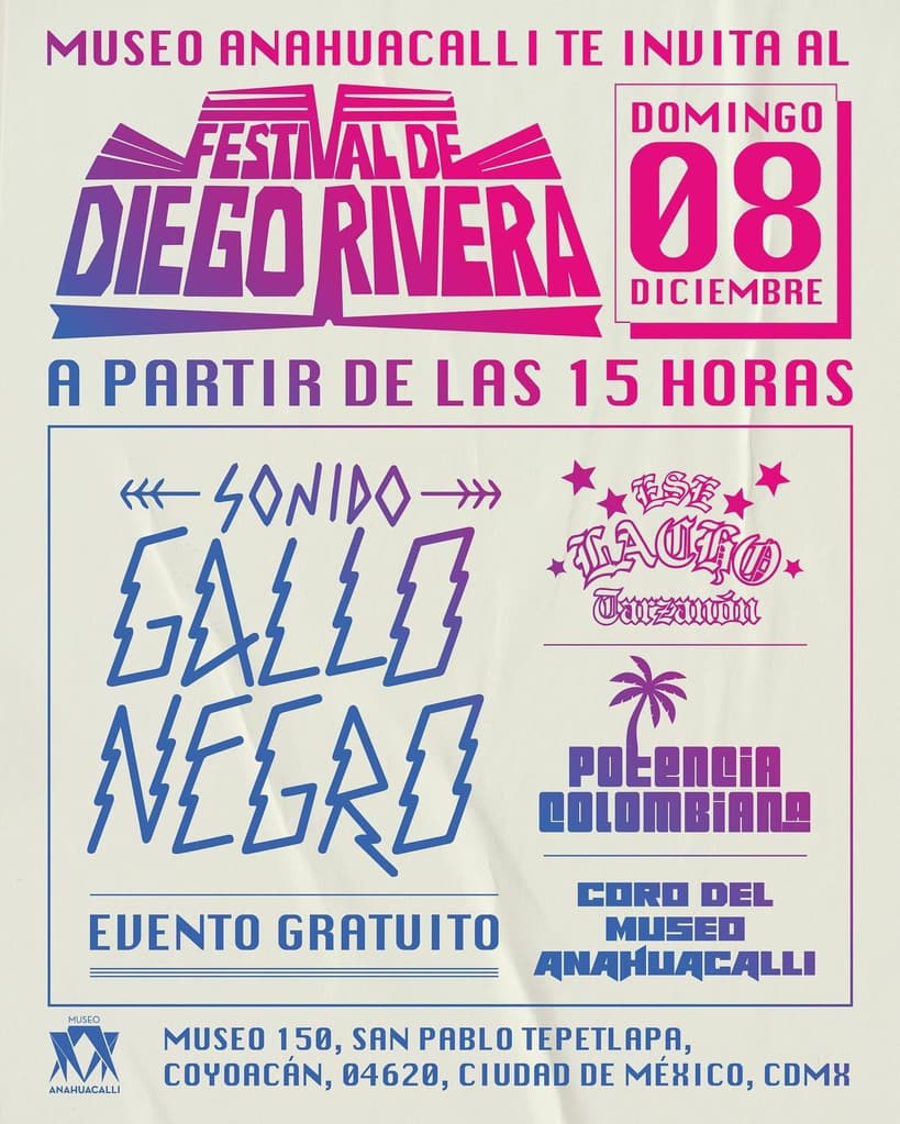 El acceso al festival comienza a las 14:30 horas del domingo 8 de diciembre. La cita es en el Museo Anahuacalli, ubicado en calle Museo 150, San Pablo Tepetlapa, Coyoacán.