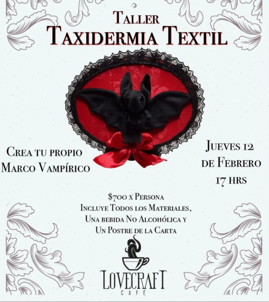 ¿Quieres darle un toque oscuro a tu decoración? Apúntate al taller de taxidermia textil que se realizará en Lovecraft Café el jueves 12 de febrero a partir de las 17:00 horas. El costo por persona es de $700. ¡No te quedes sin lugar! Reserva el tuyo enviando un mensaje a sus redes sociales antes de que caiga la noche.