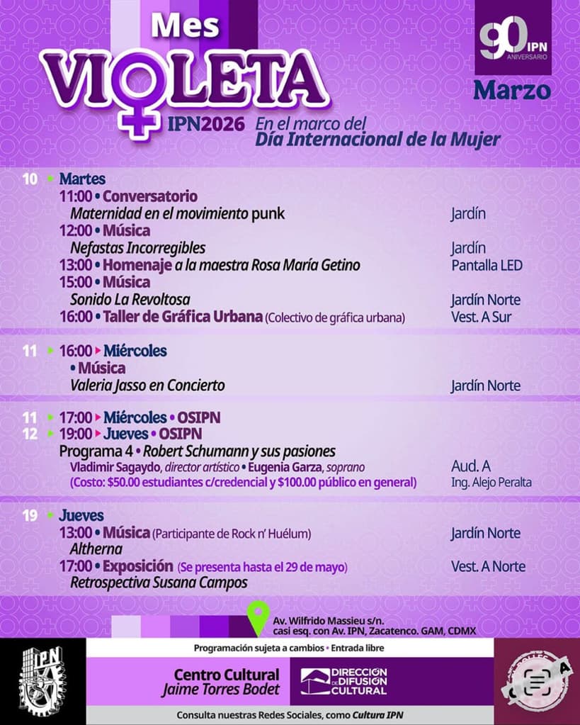 - Viernes 20 de marzo, 19:00 horas: Dentro del ciclo de Jóvenes Directoras Latinoamericanas, se llevará a cabo el concierto “Entre voces y símbolos: mujeres que inspiran” en el Centro Nacional de las Artes.
