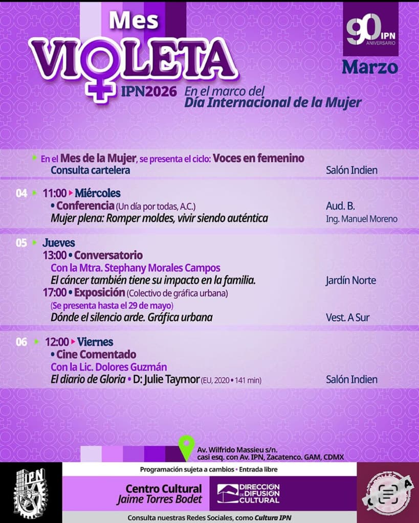En conmemoración del 8M, Día Internacional de la Mujer, el Centro Cultural “Jaime Torres Bodet” del IPN llevará a cabo una jornada de actividades con entrada libre. El evento busca fomentar la reflexión sobre la importancia de la garantía de los derechos de las mujeres, así como el reconocimiento de su valiosa contribución en todos los ámbitos de la sociedad.