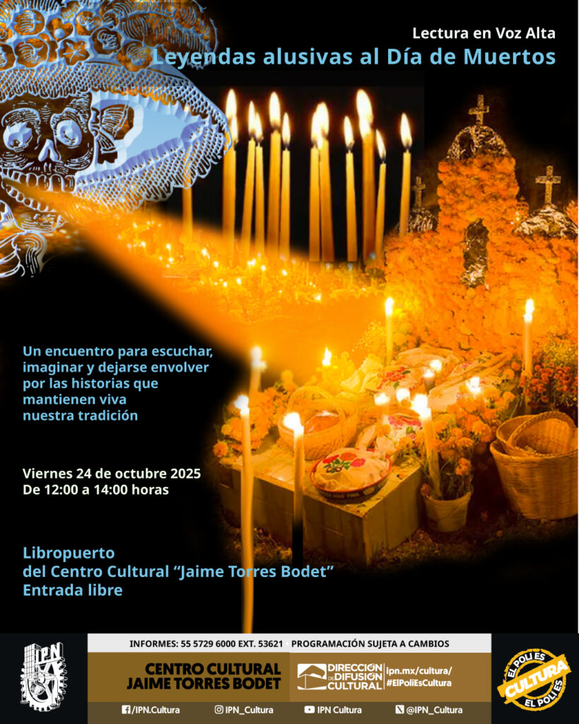 Para los amantes de la literatura y el terror, el IPN realizará una lectura de leyendas alusivas al Día de Muertos el viernes 24 de octubre, de 12:00 a 14:00 horas. Será un encuentro para escuchar, imaginar y dejarse envolver por las historias que mantienen viva esta tradición.