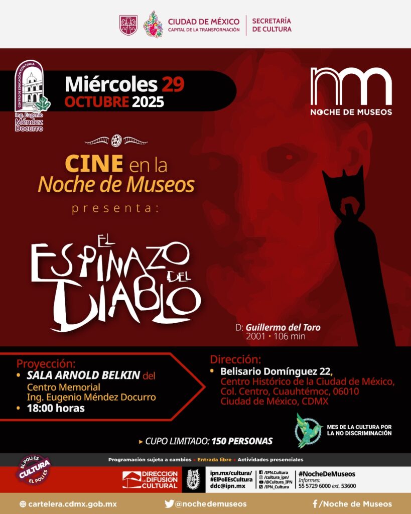 La Noche de Museos regresa al IPN. El miércoles 29 de octubre se proyectará la película El espinazo del diablo (2001), del director Guillermo del Toro. La función será en el Centro Memorial Ing. Eugenio Méndez Docurro, a las 18:00 horas.