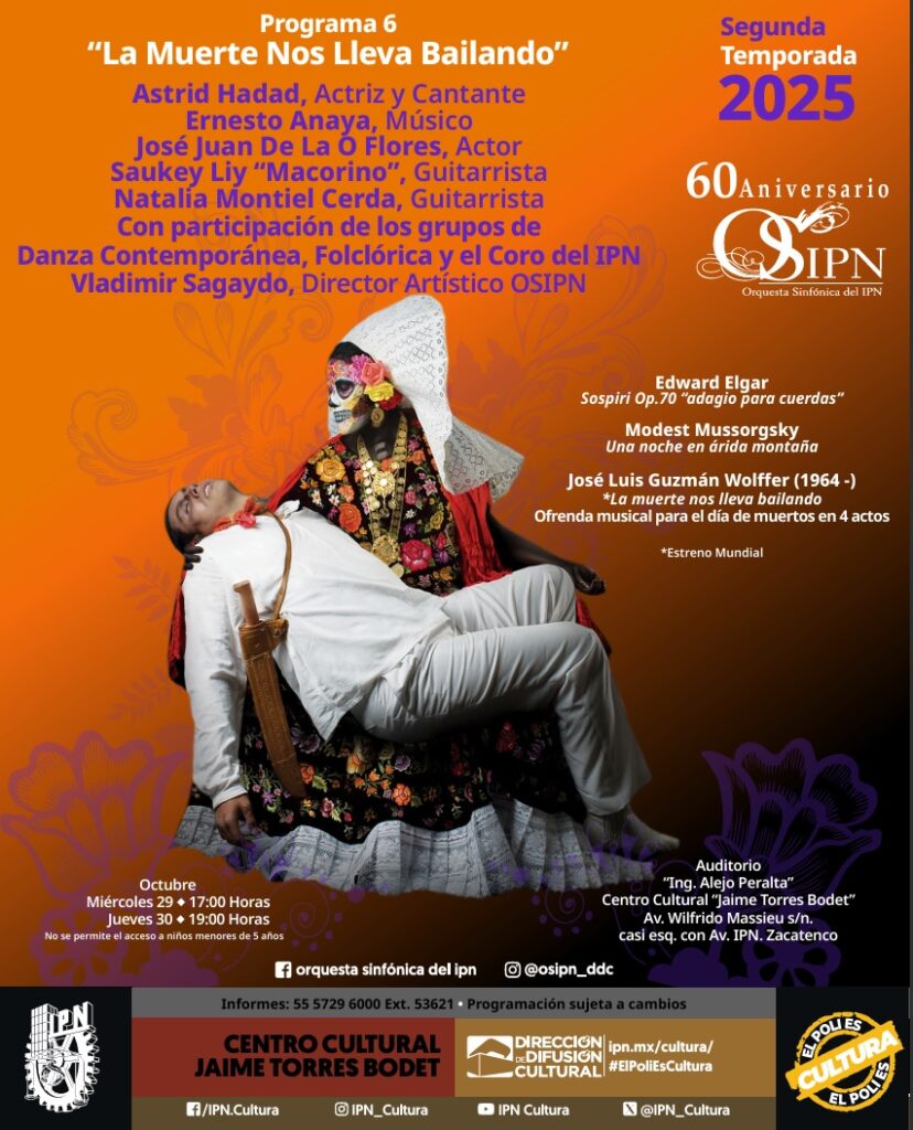 Como parte del festival, la Orquesta Sinfónica del IPN presentará el concierto “La Muerte nos lleva bailando”, una ofrenda musical acompañada del coro y grupos de danza. Una de las grandes sorpresas será la participación de la actriz y cantante Astrid Hadad, entre otros invitados especiales.
