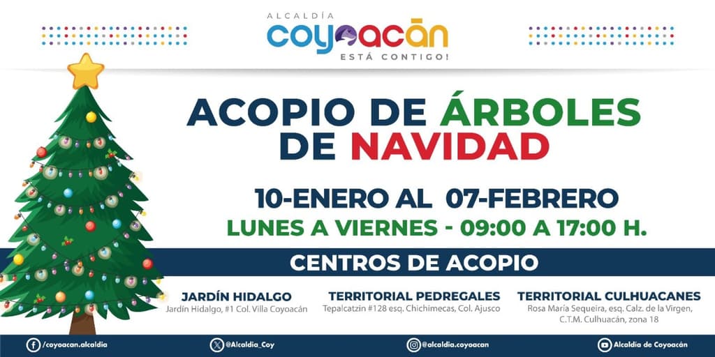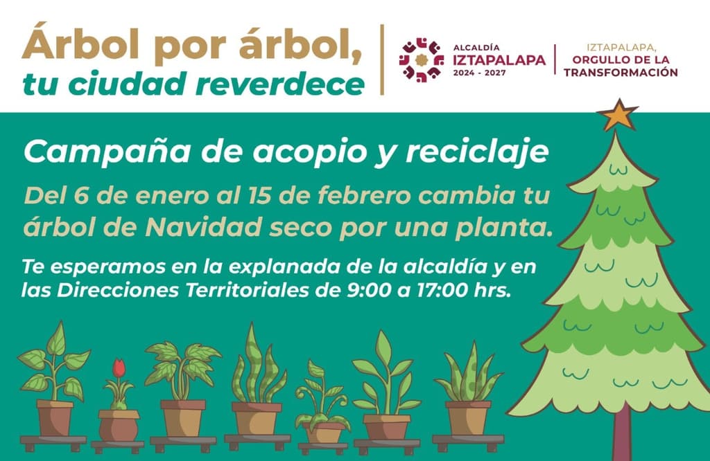 Por otro lado, en Iztapalapa, puedes llevar tu árbol de Navidad al centro de acopio ubicado en la explanada de la alcaldía. O si lo prefieres, también hay otros centros de acopio en las distintas direcciones territoriales. La fecha de recepción es del 6 de enero al 15 de febrero en un horario de 9:00 a 17:00 horas.
