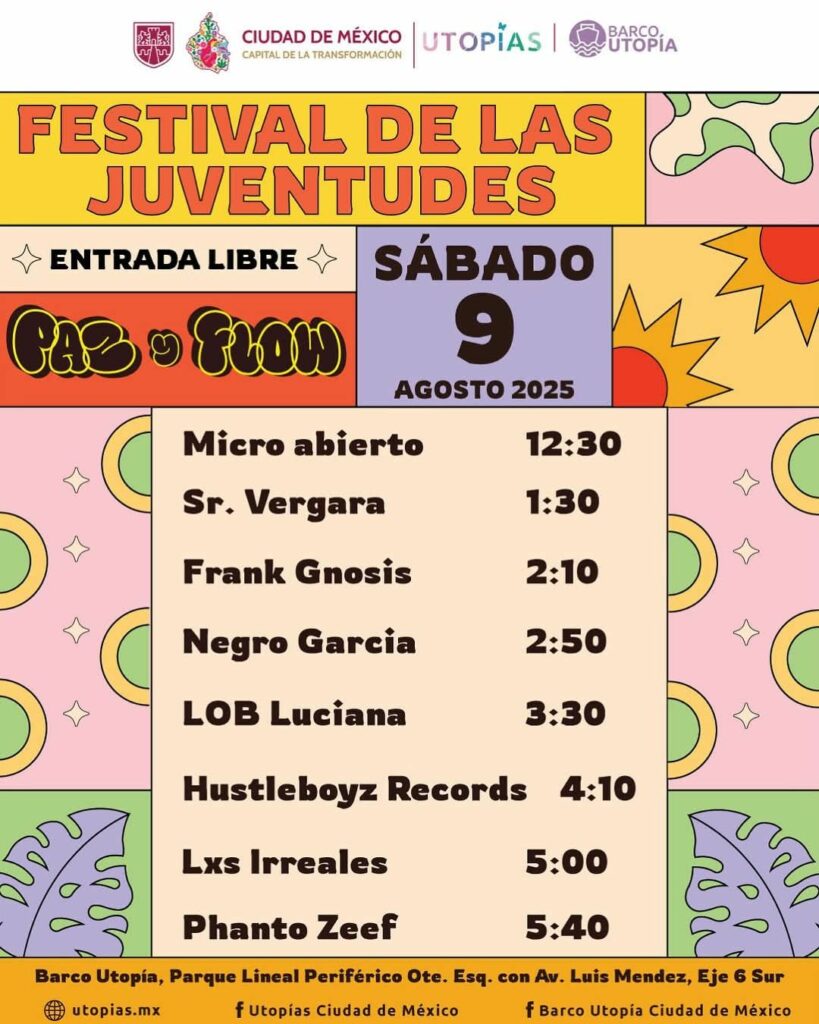 - El sábado 9 de agosto, a partir de las 12:30 horas, se realizará Paz y Flow, una festival de rap y freestyle con beats, barras y más.