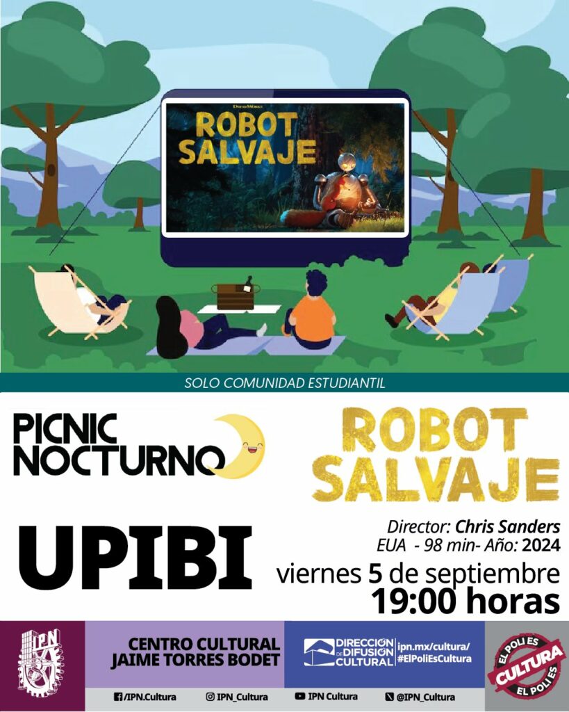 Por el 38 aniversario de la UPIBI, el Instituto Politécnico Nacional (IPN) realizará un picnic nocturno sólo para estudiantes. Proyectarán la película Robot salvaje (2024), que cuenta la historia de Roz, un robot que debe aprender a adaptarse a su nuevo entorno.