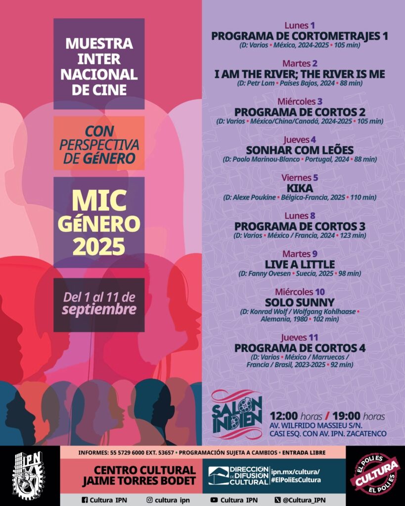 El Centro Cultural “Jaime Torres Bodet” del IPN será una de las sedes de la Muestra Internacional de Cine con Perspectiva de Género 2025. Algunas de las cintas que se proyectarán son: I Am the River; the River Is Me (Países Bajos, 2024), Kika (Bélgica – Francia, 2025), Solo Sunny (Alemania, 1980), además de una selección de cortometrajes.