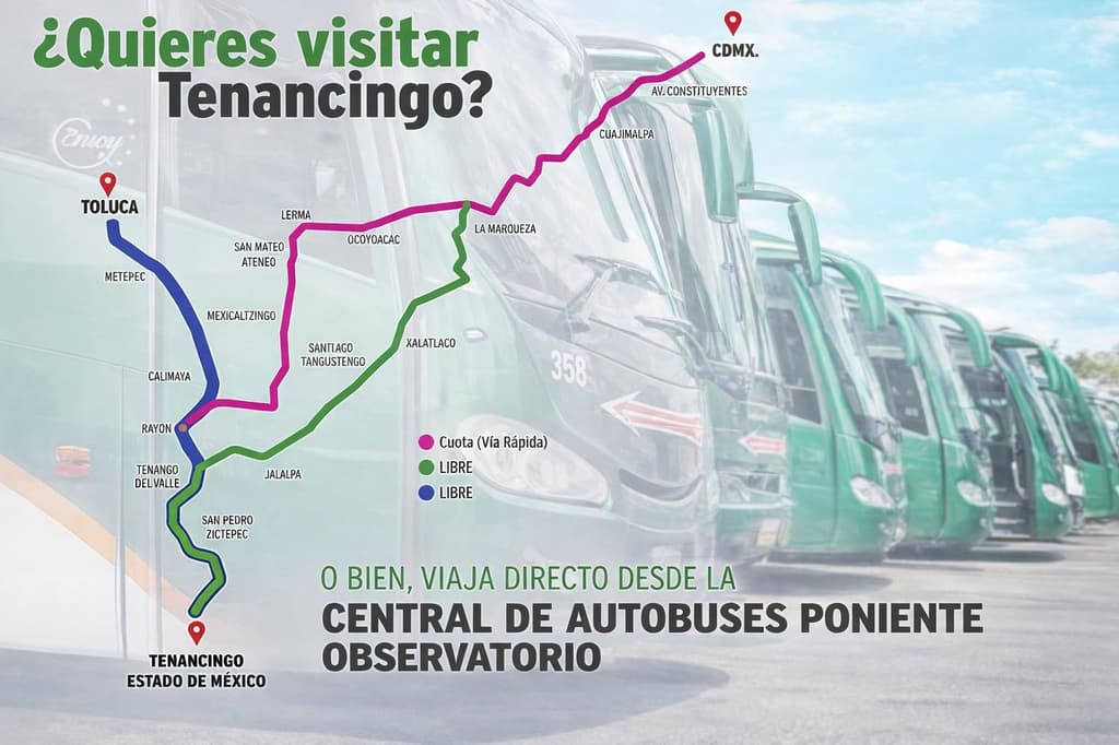 Para ir en transporte público, puedes tomar un autobús desde la terminal de Observatorio. También puedes llegar por el Tren Interurbano El Insurgente, bajarte en Metepec y de ahí tomar un taxi o camión a Tenancingo. Otra opción es bajar en la estación Toluca Centro y tomar transporte hacia el municipio.