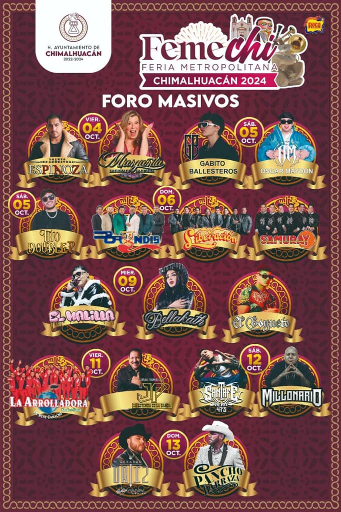 En Chilango, te compartimos la lista completa de los conciertos que se presentarán en la Feria de Chimalhuacán 2024 y las fechas de cada uno.