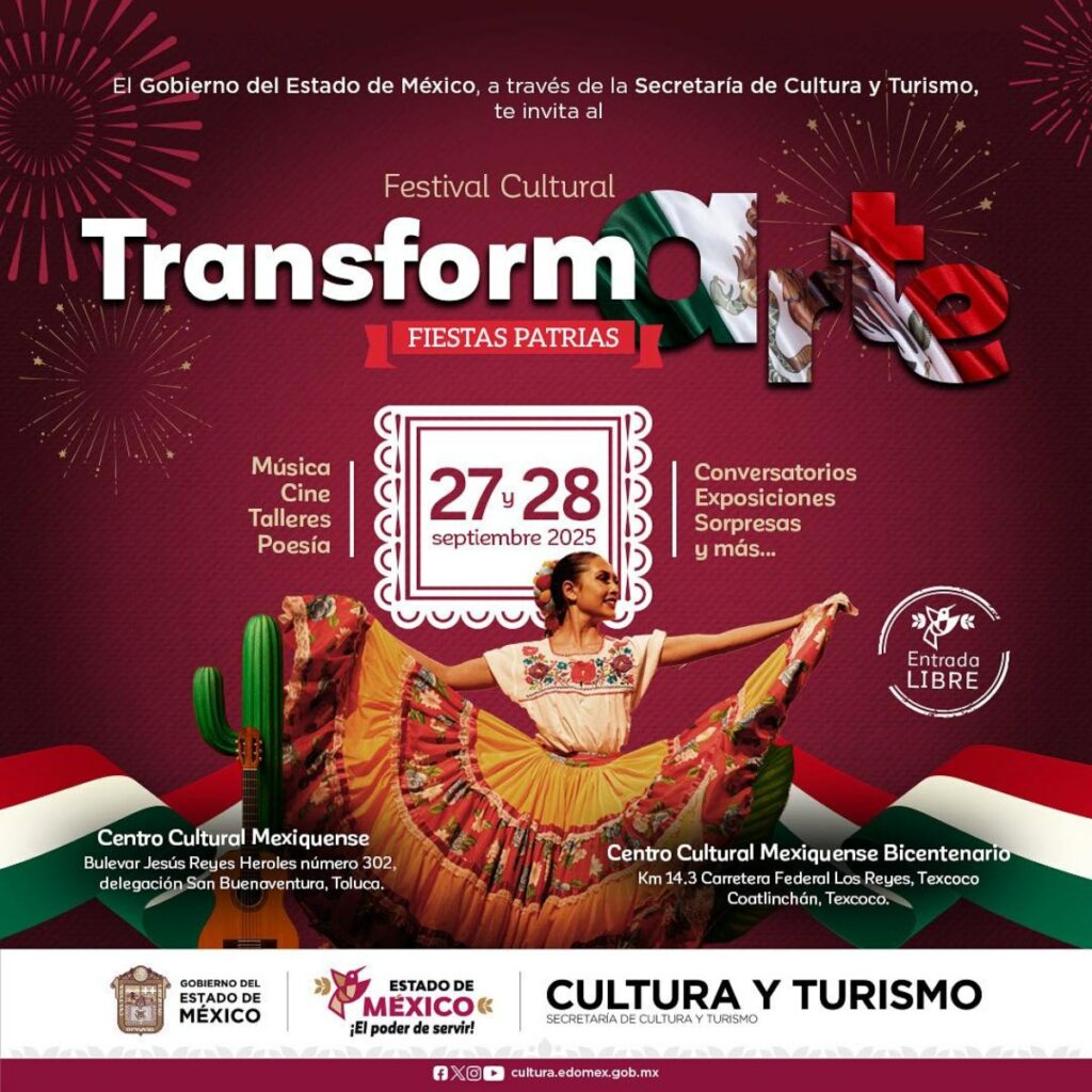 El Festival Cultural Transformarte se llevará a cabo en el Estado de México los díasl 27 y 28 de septiembre de 2025. Las actividades, que comenzarán a las 11:00 horas, se realizarán tanto en el Centro Cultural Mexiquense como en el Centro Cultural Mexiquense Bicentenario en Texcoco. La entrada es gratuita.
