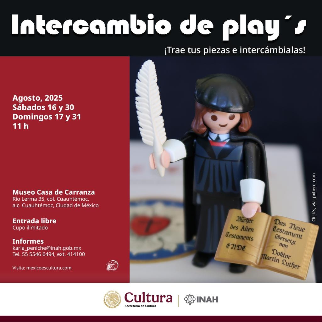 El intercambio de Play’s se realizará en el Museo Casa de Carranza, ubicado en la calle Río Lerma 35, colonia Renacimiento, alcaldía Cuauhtémoc. Este recinto abre sus puertas de martes a domingo de 10:00 a 17:00 horas.