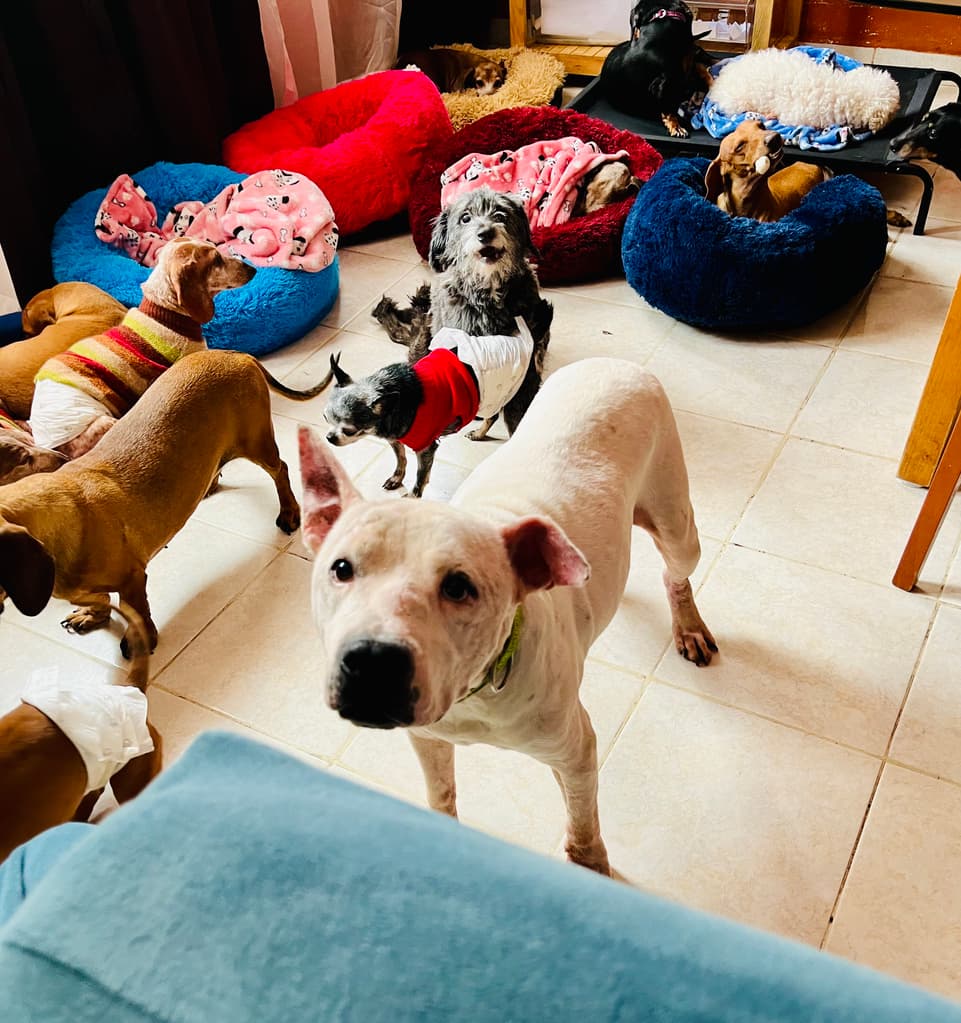 Con ella viven decenas de perritos, muchos de edad avanzada, que han sobrevivido a situaciones extremas. La casa es un “cuartel”, los recién llegados son “reclutas”, los que tienen más tiempo son “veteranos” y juntos son una “tropa-manada”.