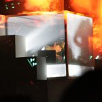 Pasadas las 21:00 horas el telón negro se abrió y como si se sincronizara con el clima, dejó de llover. Una enorme estructura de formas cuadradas se erguía sobre el escenario, como si se tratara de cajas perfectamente apiladas.