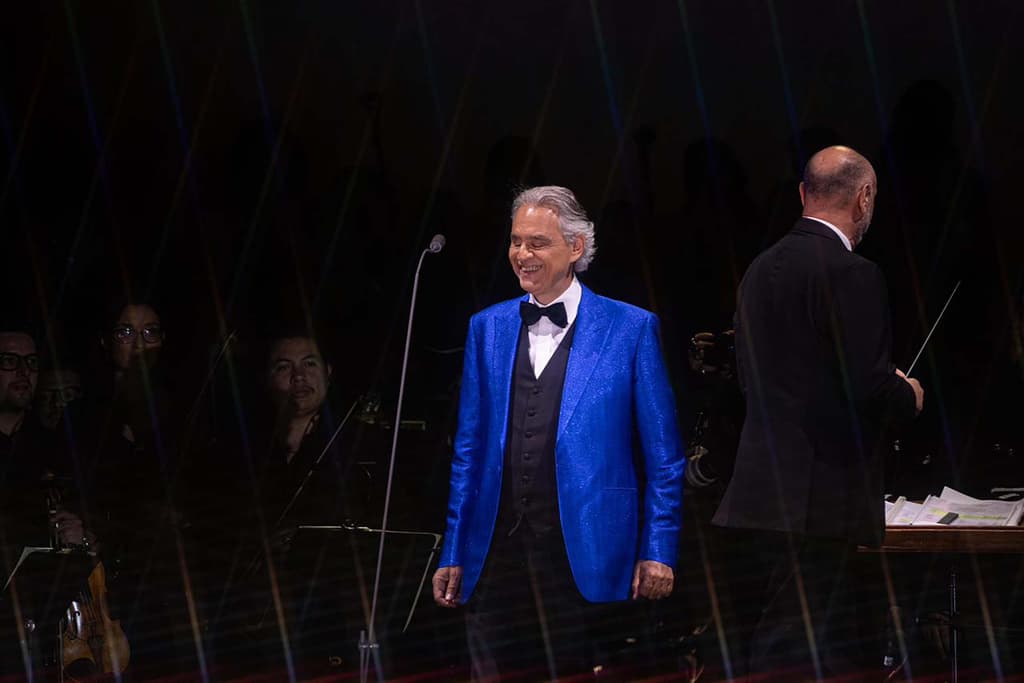 Vestido con un elegante saco azul, Bocelli puso la piel chinita de los asistentes con interpretaciones como la famosa La donna è mobile y Di quella pira, cabaletta de la ópera Il trovatore, ambas del compositor Giuseppe Verdi.