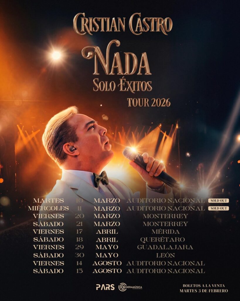 Como su nombre lo dice, el Nada – Sólo Éxitos Tour 2026 de Cristian Castro trae justo eso. Por lo que si eres fan, te esperan dos conciertos memorables con el “gallito feliz”. Seguro cantará “Azul”, “Por amarte así”, “No podrás”, “Nunca voy a olvidarte”.
