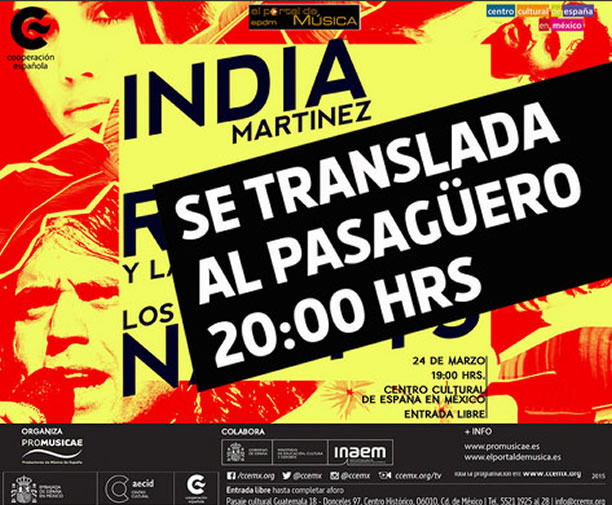 El concierto con La India Martinez, Rulo y la Contrabanda y Los Nastys cambia de sede al Pasagüero, a la misma hora (20 h) y con entrada libre hasta que se alcance la capacidad del lugar. (Los boletos que se habían entregado serán válidos).