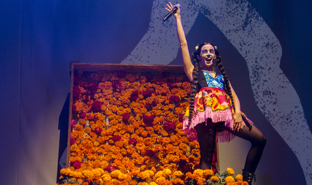 Se abrió una caja gigante llena de flores de cempasúchil en colores amarillo y rosa que conformaba la escenografía que sugería el inicio de un ritual, y Catalina García manifestó expresamente una de las peculiaridades del porqué la banda visitaba nuestro país precisamente en estas fechas. Una falda de coloridos bordados, el cabello recogido en dos largas trenzas y el maquillaje de su rostro la convirtieron en una linda catrina que emanaba aires teatrales, cautivando a la vista con su manejo total del espacio.