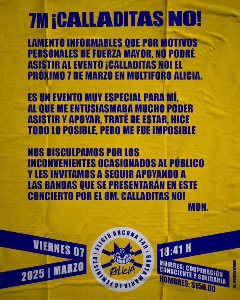 Por desgracia, durante la madrugada del 4 de marzo de 2025, Mon publicó en sus redes sociales un comunicado que anuncia la cancelación de su presentación. “Por motivos personales de fuerza mayor, no podré asistir al evento ¡Calladitas no! el próximo 7 de marzo en el Multiforo Alicia”, indicó.