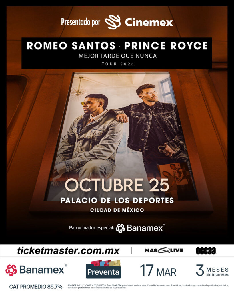 El público mexa tendrá la oportunidad de asistir al Mejor Tarde Que Nunca Tour de Romeo Santos y Prince Royce el 25 de octubre. La cita será en el Palacio de los Deportes, que retumbará con los sonidos de bachata moderna de estas estrellas. Será una noche para la historia, como ya lo es su unión.