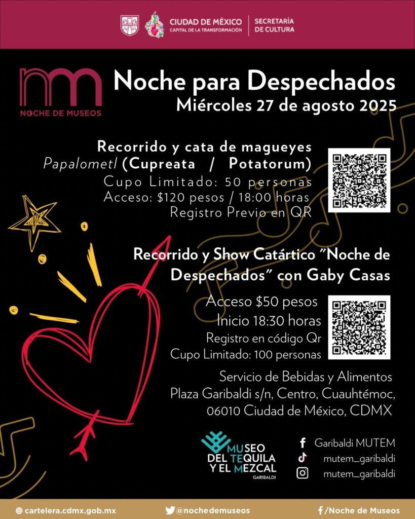 En el caso de la Noche de Despechados, la cita es en Plaza Garibaldi s/n, colonia Centro, alcaldía Cuauhtémoc. El evento en el Museo del Tequila y el Mezcal comenzará a partir de las 18:00 horas.