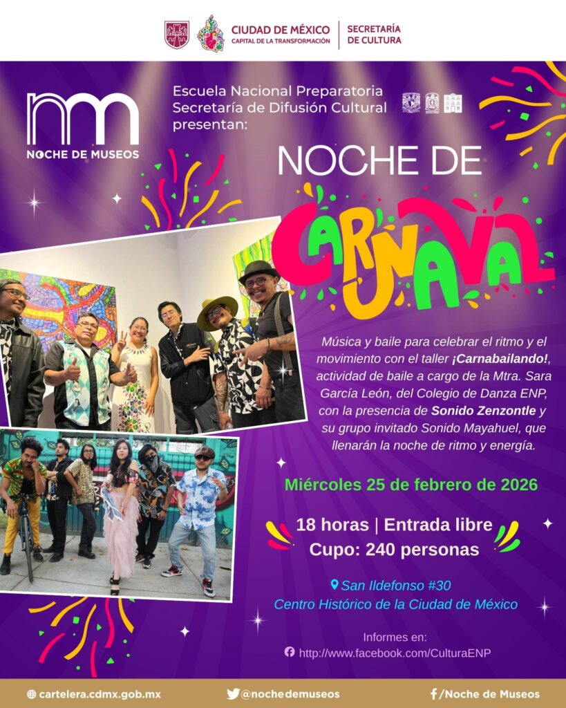 Si lo que buscas es fiesta, no te puedes perder el taller ¡Carnabailando!, actividad a cargo de la maestra Sara García León, del Colegio de Danza ENP. También estarán presentes Sonido Zenzontle y Sonido Mayahuel, que llenarán la noche de ritmo y energía.