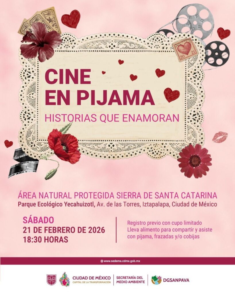 El evento “Cine en pijama: historias que enamoran” se llevará a cabo en el Parque Ecológico Yecahuizotl el próximo sábado 21 de febrero, comenzando a las 18:00 horas.