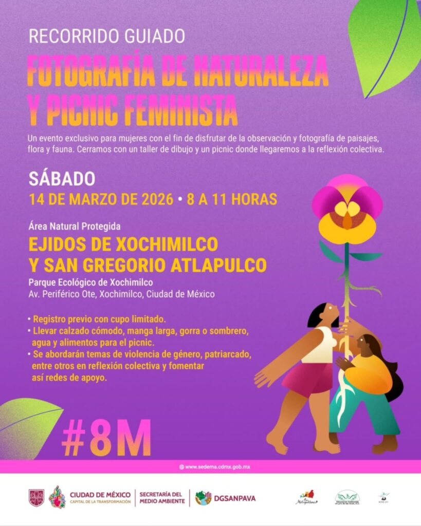 Si buscas un plan de fin de semana que combine naturaleza y conexión entre mujeres, te invitamos al recorrido guiado de “Fotografía y Picnic Feminista”. Será un espacio para la reflexión y el fortalecimiento de redes de apoyo. La cita es el sábado 14 de marzo, de 8 a 11 horas, en el Parque Ecológico de Xochimilco.