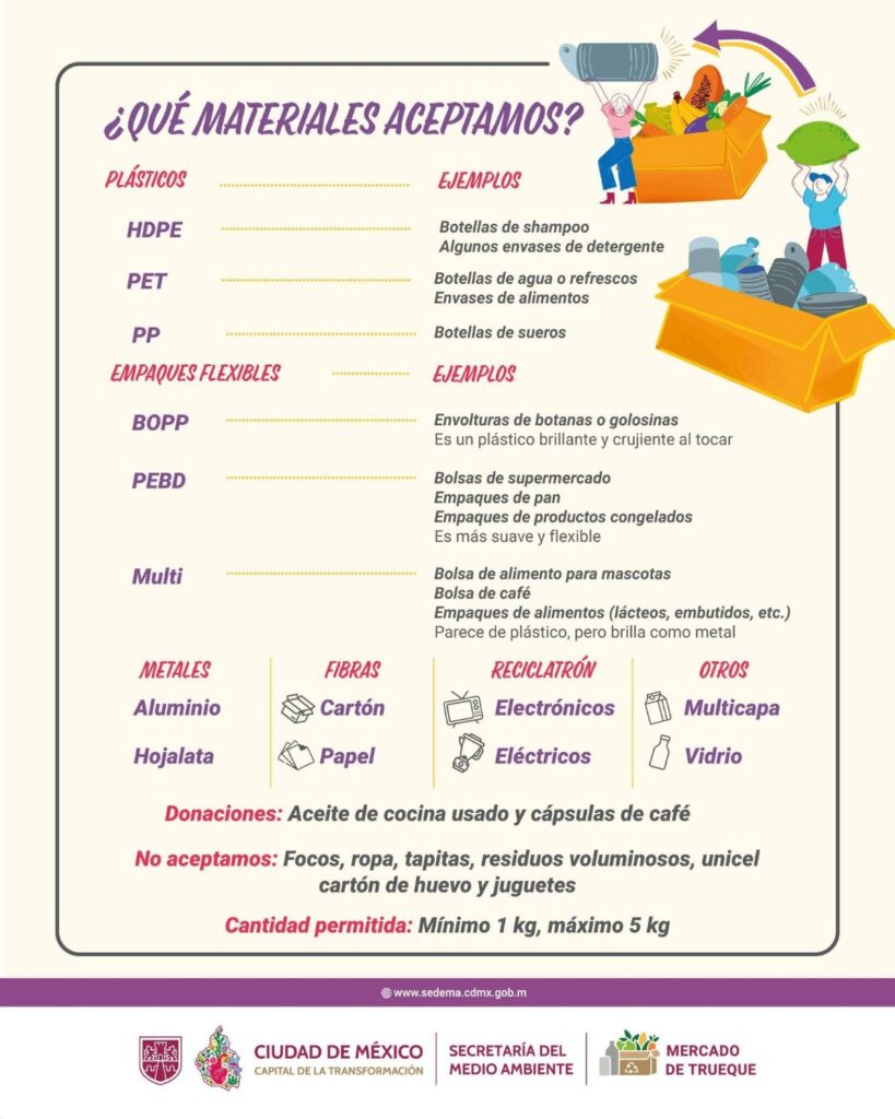 Según la Secretaría del Medio Ambiente, al Mercado de Trueque se pueden llevar los siguientes tipos de residuos para su reciclaje: