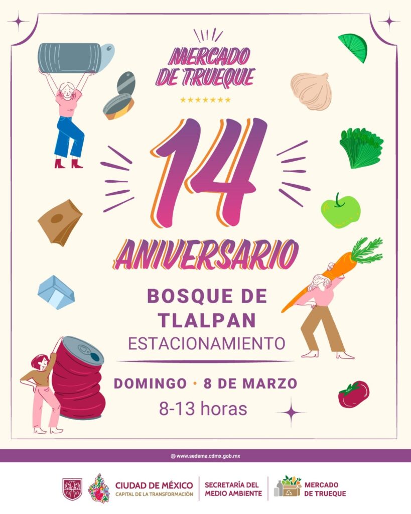 La edición de aniversario del Mercado de Trueque se realizará este domingo 8 de marzo en la alcaldía Tlalpan, donde las personas podrán llevar materiales como papel, cartón, vidrio o electrónicos para canjearlos por alimentos, plantas y otros productos.